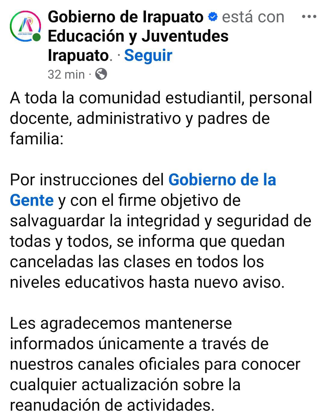 El Gobierno Municipal de Irapuato informó la suspensión inmediata de actividades escolares. La decisión responde a instrucciones del llamado Gobierno de la Gente.