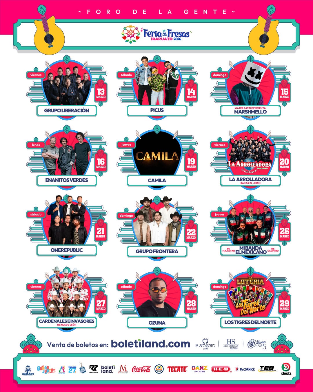 La Feria de las Fresas 2026 ofrecerá una cartelera de nivel mundial que consolida a Irapuato como referente del entretenimiento nacional e internacional. Artistas como OneRepublic, Marshmello, Ozuna, Grupo Frontera, La Arrolladora Banda El Limón y Los Tigres del Norte encabezarán el Foro de la Gente.