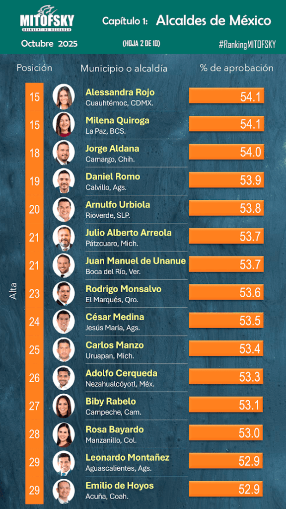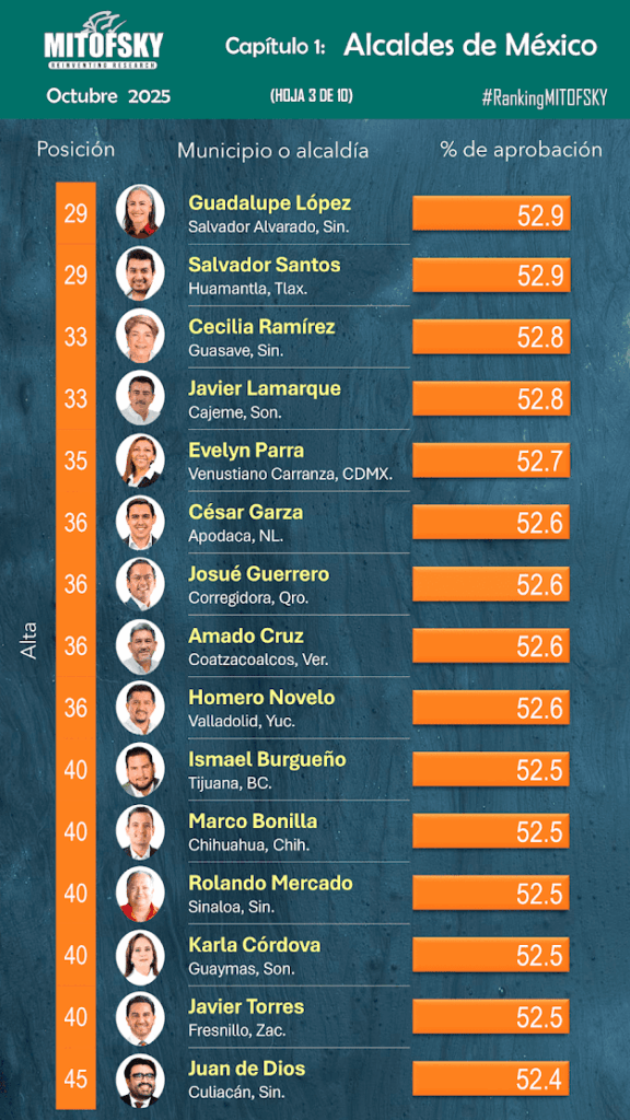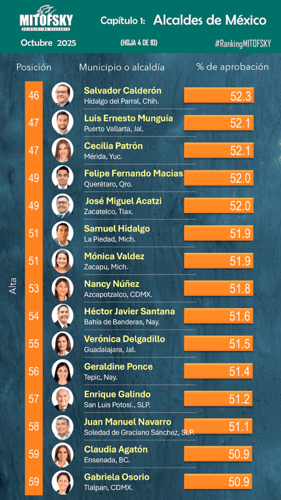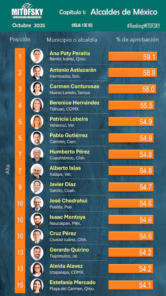 Este Ranking Mitofsky no es, como algunos intentan presentarlo, un cuadro de honor ni un mapa de liderazgo territorial. Es todo lo contrario: es un diagnóstico despiadado del desgaste municipal, una radiografía que revela que la mitad de los alcaldes del país gobierna con menos del 50% de aprobación, es decir, sin un respaldo social sólido para sustentar sus decisiones.